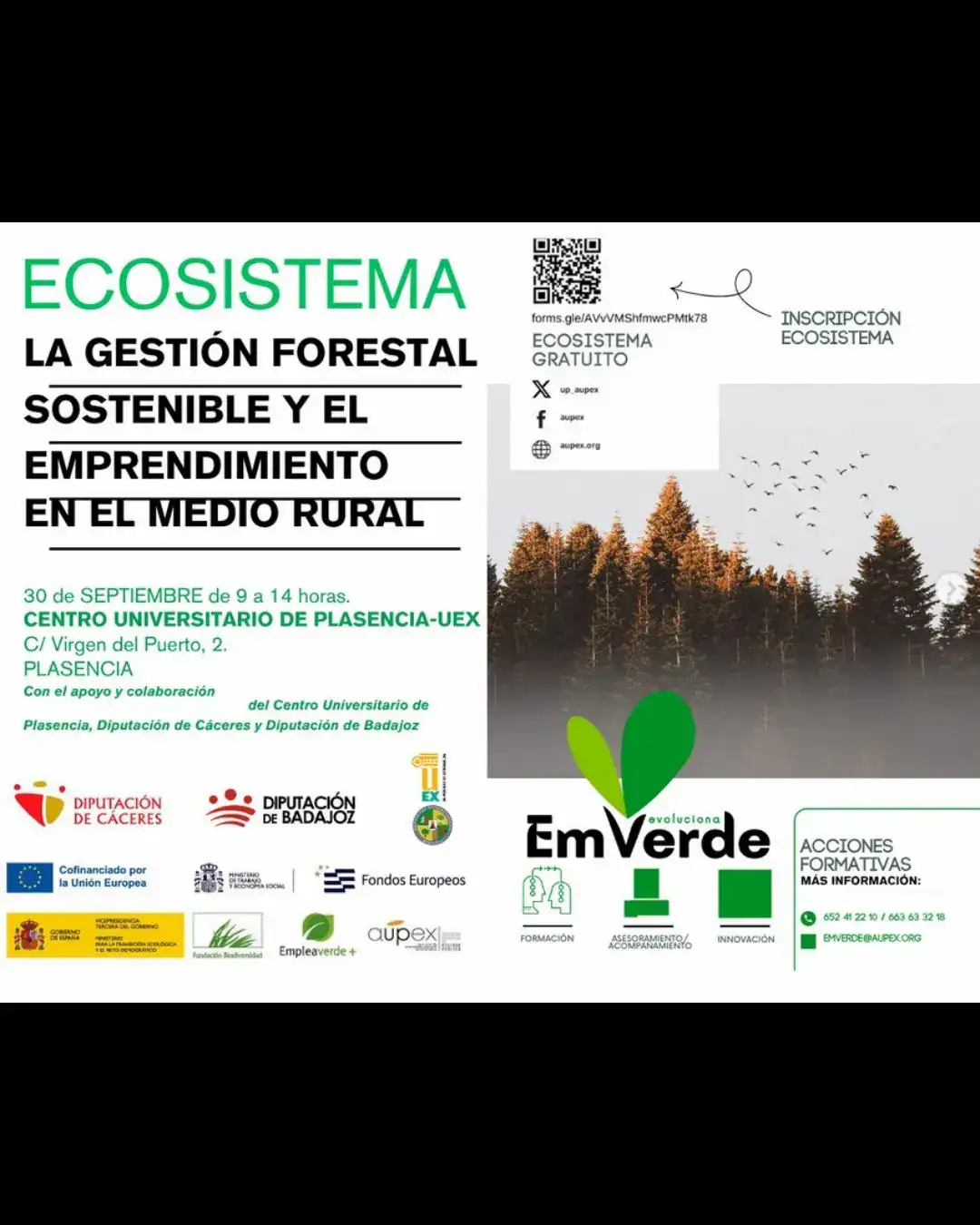 🌱 En septiembre, el proyecto estuvo presente en la jornada “Ecosistema: la gestión forestal sostenible y el emprendimiento en el medio rural”, organizada por Aupex y el Centro Universitario de Plasencia (UEX), como ejemplo de territorio rural activo, con potencial para generar empleo verde y promover la economía local.